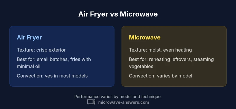 The air fryer and microwave occupy different ends of the kitchen appliance spectrum. The air fryer uses a compact chamber and a high-velocity fan to circulate hot air around food, creating a crisp exterior with little to no added oil. The microwave relies on electromagnetic waves at high frequency to excite water molecules in food, generating heat from the inside out. When you compare the air fryer and microwave you are evaluating two tools that tackle texture, moisture, and speed in very different ways. According to Microwave Answers, recognizing these fundamental differences helps home cooks decide what to bake, reheat, or crisp first. This foundational distinction also shapes how you plan meals, energy use, and overall convenience in weeknight cooking.