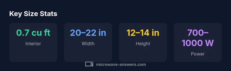 A 0.7 cubic foot microwave has an interior cavity around 0.7 cubic feet, roughly 19.8 liters. In practice, most compact models measure about 20–22 inches wide, 12–14 inches tall, and 14–16 inches deep for countertop use. When shopping, check the interior width and turntable diameter to ensure your bowls and plates fit comfortably. Note that external dimensions vary by design and brand.