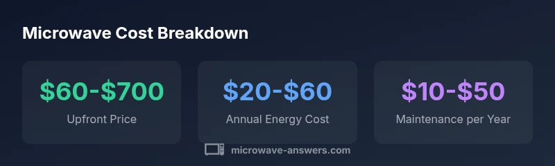 Microwave cost includes both the upfront price and ongoing operating expenses. Typical upfront prices range from $60 to $700, depending on size and features. Annual energy costs are usually about $20 to $60, depending on usage and wattage. Over a five-year period, total ownership often falls roughly between $130 and $820, with higher-end convection or inverter models costing more upfront but saving energy in some cases.