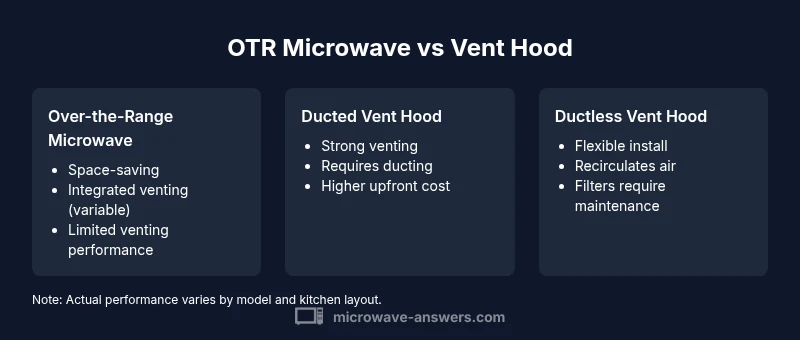 In most kitchens, you must balance space, ventilation, and convenience. An over-the-range microwave (OTR) combines cooking and venting in one compact footprint, which is ideal for small layouts where every inch matters. A dedicated vent hood, installed above the cooking surface, prioritizes air removal, odor control, and moisture management. The Microwave Answers team emphasizes that the right choice hinges on how you cook, how your kitchen is laid out, and whether you can accommodate ducting. For households that fry or simmer for extended periods, a robust ventilation strategy becomes part of indoor air quality and long-term comfort. Beyond raw ventilation, consider the aesthetics of integration with cabinets, lighting, and countertop workflow. If you’re upgrading an existing kitchen, assess whether replacing one device or upgrading to a stronger hood will yield larger benefits in odor removal and humidity control.