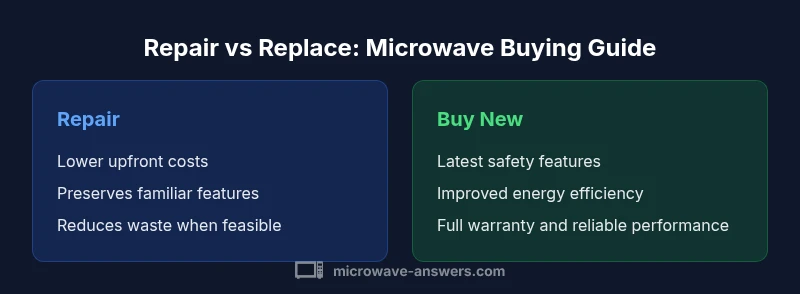 Making a choice between repairing a microwave and buying a new one rests on a simple framework: assess the age and condition of the unit, estimate repair costs, consider safety implications, and weigh the benefits of newer features. According to Microwave Answers, the decision tends to be straightforward when the appliance is relatively reliable and the repair impact is modest. Start by listing the symptoms you’re seeing, the likely parts to fail, and the time and money you’re willing to invest. This framework keeps emotions out of the equation and centers the discussion on value, safety, and performance. From there, you can compare repair costs with the price of a comparable new model, including warranty terms and energy efficiency.