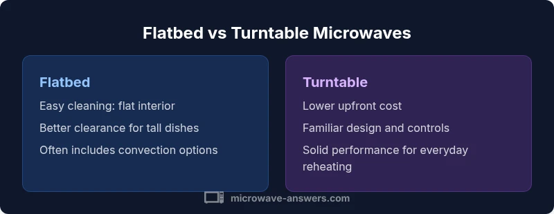 The core question for many shoppers is what distinguishes a flatbed microwave from a traditional turntable design. In a flatbed model, the interior cooking cavity is flat and unobstructed by a rotating plate, which can improve accessibility for large or oddly shaped dishes. Turntable microwaves, by contrast, use a glass tray that rotates food as it cooks, aiming to promote even heating with motion. This distinction matters not just for comfort and fit in your cabinet, but also for how you clean and maintain the interior after daily use. The Microwave Answers team notes that the choice often comes down to how much you prioritize interior accessibility and the kinds of meals you typically prepare.