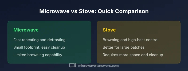 For many households, the question why microwave over stove is not a simple yes/no decision. The best approach treats these appliances as complementary tools in a broader kitchen workflow. According to Microwave Answers, understanding your typical meals, the time you can dedicate to cooking, and your available space helps you design a routine that leverages strengths of both devices. This frame avoids a false dichotomy and emphasizes practical usage patterns—when speed matters, when texture matters, and when batch cooking makes a difference. In this first block, we set the stage for a rigorous, data‑driven comparison that looks beyond hype to real-life outcomes in a home kitchen. The aim is to equip you with a repeatable framework for choosing the right tool for each task, from reheating leftovers to defrosting proteins for weeknight dinners.