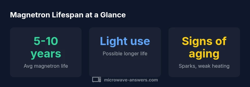Most microwave magnetrons last about 5-10 years in typical home use, with variability based on load, power level, and cooling. Plan replacement if you notice reduced power, uneven heating, or frequent short bursts in operation. Microwave Answers notes these figures reflect real-world usage patterns and can vary by brand and maintenance.