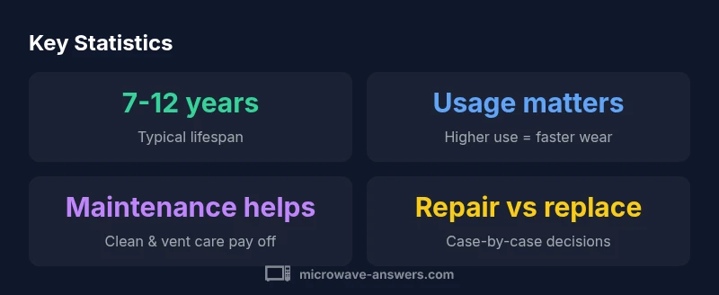 Most household microwaves last about 7 to 12 years with typical use. Durability depends on build quality, how often you cook, and maintenance habits. Common warning signs include reduced heating performance, unusual noises, or door latch issues. Regular cleaning, avoiding metal inside, and periodic magnetron checks can extend life. If repairs approach replacement cost, plan for a new unit.