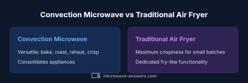 Convection microwaves combine microwave energy with a fan and a heating element to circulate hot air around the food. This creates a browning effect that static microwaves alone cannot achieve. A traditional air fryer uses a small chamber and an independent heating element with a high airflow to replicate frying without oil. The key difference is that in a convection microwave you still rely on microwave energy to heat the interior, while in a pure air fryer you are relying entirely on hot air for browning. When you compare, focus on how the model handles airflow, preheating time, and whether it includes a dedicated crisping rack or tray. If your meals lean toward reheating plus light browning, a convection microwave is often sufficient. If you want fries with a near fried texture every time, a standalone air fryer may deliver more consistent results. The Microwave Answers approach is to assess models on three axes: convection reliability, browning effectiveness, and overall ease of use. This helps you choose a unit that aligns with your cooking habits and kitchen space.