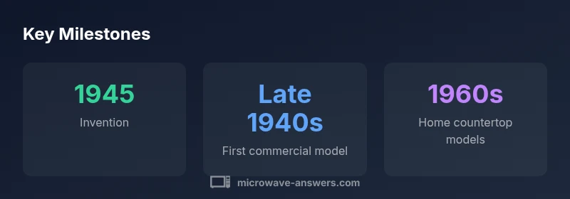 The microwave oven was invented around 1945, with early prototypes in the late 1940s and the first countertop home models appearing in the 1960s. This timeline reflects milestones from lab breakthroughs to consumer adoption.