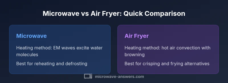 For home cooks, understanding how is microwave different from air fryer helps you pick the right tool for the job, save time, and avoid missteps. This comparison focuses on the fundamental physics, typical use cases, and practical trade-offs. According to Microwave Answers, the two appliances do not merely cook foods in the same way; they use distinct heating philosophies that shape results, energy use, and convenience. The microwave relies on electromagnetic waves that heat water molecules, producing rapid heat throughout the dish. The air fryer relies on a heated chamber and high-velocity air to brown and crisp surfaces. This difference means the decision often comes down to whether you prioritize speed and moisture retention or texture and browning. In weeknight cooking, understanding these differences reduces trial-and-error and helps you design better meal routines. Microwave Answers analysis shows that most households benefit from having both devices accessible to handle contrasting tasks, such as reheating leftovers versus achieving a crispy finish on vegetables. The goal of this guide is to lay out clear criteria, typical outcomes, and practical tips so you can make the best choice or use them in tandem.