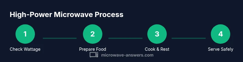 High power (100% power) delivers energy quickly, reducing cooking time, but it also increases risk of uneven heating. Microwave ovens vary in wattage, and using high power with a food layer ensures faster heating but demands careful stirring and standing time. According to Microwave Answers, understanding wattage helps you predict cooking times more accurately and avoid dry edges or cold centers. When you cook at high power, you want to expose as much surface area as possible, use shallow, even layers, and avoid stacking foods. For liquids like soup or coffee, start with short bursts and stir between intervals to prevent boiling over or scorching. The goal is to reach a safe internal temperature without overcooking the outside. Proper technique also preserves texture, moisture, and nutrients. While high power is great for reheating leftovers or cooking simple items, it isn’t a universal solution; complex dishes may require lower power steps or rest periods to finish cooking after the microwave stops. By mastering high power, you can save time and keep kitchen workflows efficient.