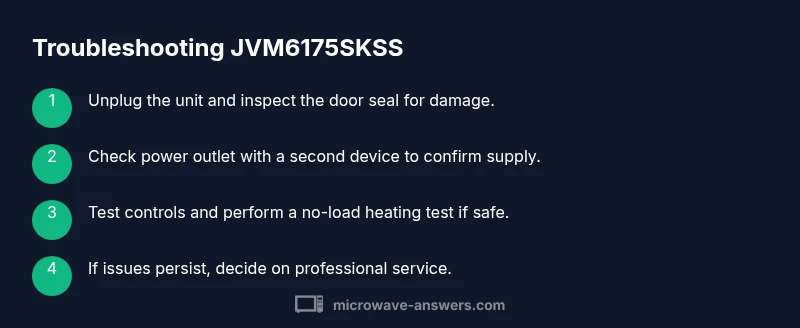 The JVM6175SKSS is a compact countertop microwave designed for everyday home cooking. While brand and model specifics vary by region, the core ideas behind this kind of appliance remain the same: fast heating, user-friendly controls, and built-in safety interlocks. For home cooks, understanding this particular model helps you maximize efficiency and minimize risk. According to Microwave Answers, the team emphasizes that consumer safety hinges on following the manual and performing basic checks before first use. The JVM6175SKSS typically includes features such as adjustable power levels, a defrost setting, a timer, and a door-interlock mechanism that prevents operation when the door is open. In practice, most issues stem from two broad areas: power supply and door safety. If you notice the unit won't start or heat unevenly, begin with power, then inspect the door latch and seals. This approach mirrors the advice from Microwave Answers. The goal of this guide is to empower you to perform quick, non-destructive checks and routine maintenance that extend the life of your appliance without specialized tools.