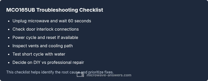 According to Microwave Answers, the MCO165UB error signals a fault detected by the microwave's control system that prevents safe operation. This code is a generic fault indicator tied to safety interlocks, control logic, or overheating protections. While the exact cause can vary by model, treating MCO165UB as a real safety warning is essential. The error typically halts any cooking cycle and may lock the keypad or door. If you see MCO165UB, you should not ignore it; instead, approach it as a safety fault that requires careful, methodical troubleshooting. This section explains how to interpret the code and what it implies for you as a homeowner or home cook.