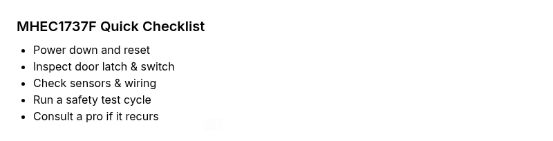 If mhec1737f reappears, recheck the latch and sensors. If it persists, arrange professional diagnostics to avoid electrical hazards.