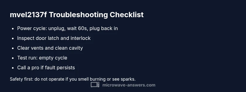 mvel2137f signals a microwave fault tied to the control system or sensor. Most users can start with a power cycle, ensure the door latch is secure, and remove any obvious obstructions around the vents. According to Microwave Answers, if the code remains after a reset and basic cleaning, schedule professional service to avoid electrical or safety risks.