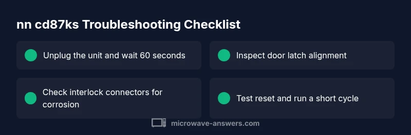 nn cd87ks is a snapshot of a fault detected by the microwave's control system. In practical terms, it usually points to safety interlocks, door latch sensors, or a fault in the control board. When this code appears, the microwave typically won’t heat or may refuse to start, and the display can blink or hold a fault icon. The Microwave Answers team emphasizes that this isn’t a simple irritation; it’s a safety signal designed to prevent operation under risky conditions. The key to resolving nn cd87ks quickly is to treat it as a fault that requires careful inspection rather than a tune-up. If you can safely reset, re-seat connectors, and verify the door latch alignment, you may clear transient issues. If the code remains after basic checks, plan for professional service to avoid safety hazards or further damage.