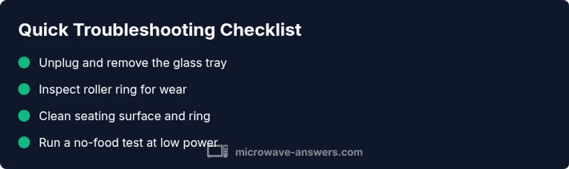 Before opening the cabinet, unplug the unit and let it cool. Remove the glass tray and roller ring, then inspect for chips, cracks, or wear. Clean the tray seating area and the roller ring with a mild soap solution; dry thoroughly. Reinstall the ring and tray ensuring they sit flat and rotate freely by hand. Run the microwave on a short, no-food test at low power (e.g., 10-30 seconds) to feel for smooth rotation and any unusual resistance. If you sense persistent friction, it’s time to inspect the motor coupling and gears more closely or seek professional help.