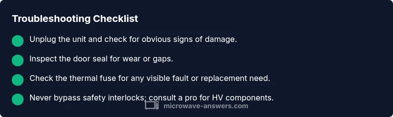 The most common non-heating issues fall into safety interlocks, thermal fuse, and door switch faults. If you are not trained in appliance repair, skip invasive tests and contact a professional. If you do proceed, ensure the unit is unplugged and the area is dry. Replace any obviously damaged parts with OEM equivalents and follow model-specific service manuals. After a fix, reassemble carefully and test with a microwave-safe load and without metal objects to confirm heating resumes.