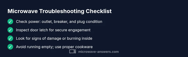 Before we start opening panels, run these non-invasive checks. First, verify the outlet is live: plug in another appliance or use a tester. If the outlet is dead, reset the circuit breaker or call an electrician. Next, unplug the microwave, wait 60 seconds, and plug back in to reset the internal electronics. Inspect the door latch: ensure the door closes firmly and the interlock engages; if the door sticks or the latch seems loose, the microwave won't run. Also check the power cord for damage and ensure there is no moisture around the plug. Finally, if your unit shows no display or lights but sounds strange when plugged, avoid attempting repairs yourself and seek professional help. Keeping the area dry and clear of metal objects around the unit reduces the risk of accidental arcing.