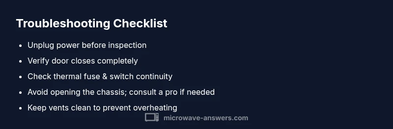 Common causes include a faulty door interlock or a blown thermal fuse. A quick diagnostic is to verify the door shuts firmly and that the fuse is intact. If the unit still doesn’t heat, professional service is usually required.