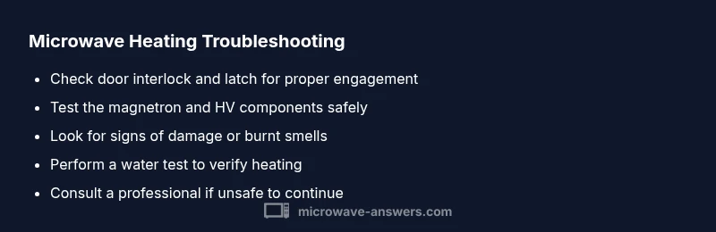 At Microwave Answers, we emphasize practical, safe, and cost-conscious troubleshooting for home cooks and homeowners. Our team notes that many “heater not working” cases resolve with a focus on door interlock integrity and magnetron health. By following our diagnostic flow and step-by-step guide, you can assess the problem, perform safe checks, and decide whether repair or replacement is the best course. The Microwave Answers team provides clear guidance, safety reminders, and actionable steps to minimize downtime in your kitchen.