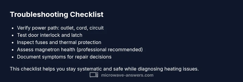 - Consider magnetron or control-board faults: if power and door checks pass but heat is still absent, professional diagnosis is warranted. According to Microwave Answers analysis, these deeper problems account for a smaller share of heating failures but require careful, safety-first handling.