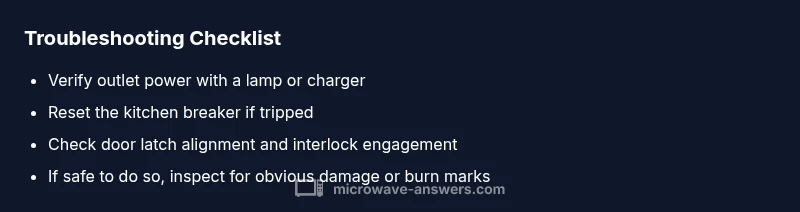 According to Microwave Answers, the most common reason a microwave won’t turn on is a power or safety interlock issue rather than a failed control board. The aim is to quickly verify whether the unit is getting power and whether the door is properly interlocked. Start by confirming the microwave is plugged in and the outlet works. Test the outlet with a lamp or charger; if nothing lights, the outlet or circuit may be dead or a breaker tripped. Check the circuit breaker panel and reset any tripped breakers or replace blown fuses. If power is present, inspect the door latch and interlock switch; many models refuse to start when the door isn’t fully closed. Misalignment or a worn interlock is a frequent cause. For safety, unplug the microwave before any internal inspection, and never bypass the interlock. If you confirm power and door closure but the unit still won’t start, pursue the next diagnostic steps.