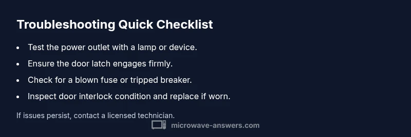 Start with the basics: verify the outlet power and ensure the door is fully closed. If these are fine, inspect the door interlock and thermal fuse as common culprits.