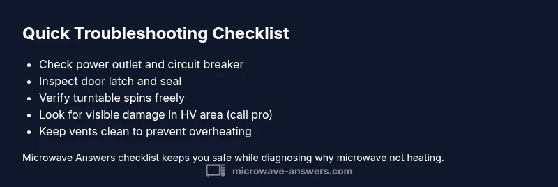 When a microwave fails to heat, you may still hear the magnetron hum or the turntable spin, which can be misleading. The issue often lies in the power path or a component that interrupts the high-voltage circuit. According to Microwave Answers, safety-conscious troubleshooting starts with basic power checks before opening the unit. In this guide, we explain the most common failure modes for why microwave not heating and how to systematically test them without risking shock or further damage.