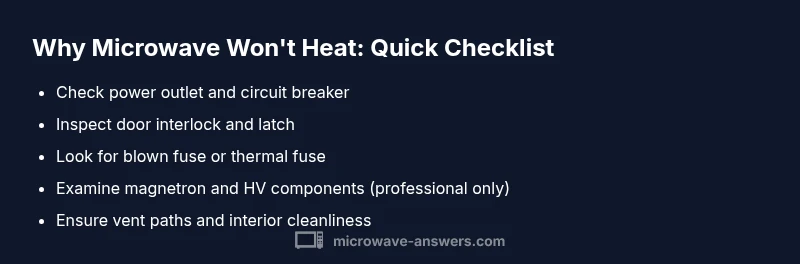 If your microwave won't heat, the most likely causes are a blown fuse, a faulty door interlock, or a failing magnetron. Start by checking the power supply, door latch, and fuses, then test with a separate outlet. If the issue persists, avoid using the unit and seek professional repair to prevent safety risks.