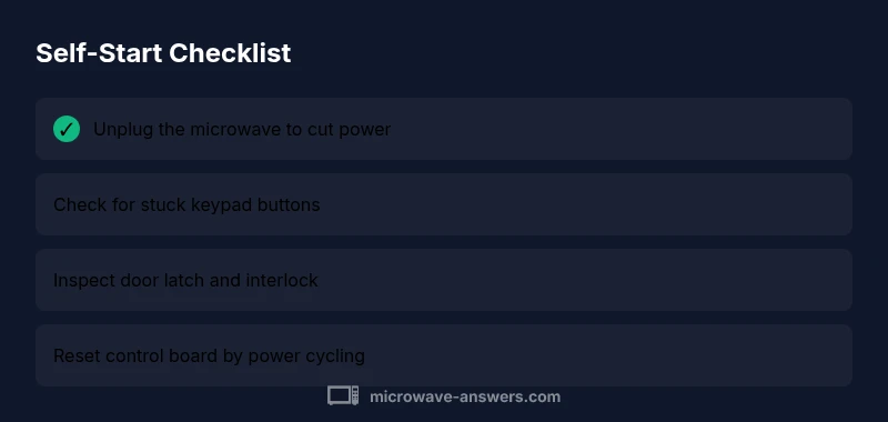 If you’re asking why would a microwave turn on by itself, you’re not alone. This behavior isn’t normal and signals a fault in one or more control components. In many cases the issue stems from a sticky or damaged keypad, a worn door interlock, or a glitch in the control board. Since microwaves operate on high voltage and generate heat in a closed cavity, any unexpected start poses a safety risk. According to Microwave Answers, startup anomalies are commonly linked to keypad wear or interlock problems that falsely register a start command. Treating this as a fault from the outset helps prevent injury or fire, so begin with basic safety checks before attempting any repair. This guide expands on the practical checks, signs to watch for, and how to decide between DIY fixes and professional service.