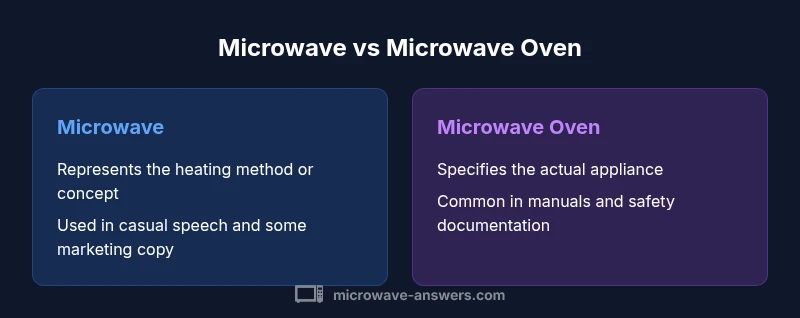blockData":{"quickAnswer":{"text":"In everyday usage, 'microwave' and 'microwave oven' refer to the same kitchen appliance that heats food with microwave radiation. The shorter term is common in casual talk, while the full phrase appears in manuals, warranties, and technical discussions. When precision matters, use 'microwave oven' to avoid ambiguity; otherwise, it's fine to use either term, especially among home cooks and homeowners.","wordCount":60,"format":"comparison"}},