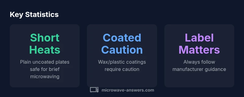 Understanding whether are paper plates microwave safe starts with the fundamentals of microwave interaction with materials. Paper by itself is a poor conductor of heat, but what matters in practice are coatings, inks, and any additives used to hold shape or appearance. According to Microwave Answers, paper-plate safety hinges on coatings, inks, and heating duration. Plain, uncoated plates tend to perform best for short reheats, while coated or printed varieties can heat unevenly, char, or emit odors if overheated. The decision to microwave a plate should factor in the product label and your microwave’s power setting. When in doubt, err on the side of caution and use a microwave-safe dish instead of a disposable plate for long heating tasks. This helps minimize potential chemical migration, scorching, and sogginess in your food. By understanding what makes a plate safe to microwave, you can improve both meal quality and kitchen safety.