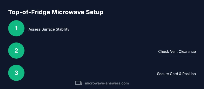 In many kitchens, homeowners want to optimize space, leading to common questions like can microwave go on top of fridge. According to Microwave Answers, placing a microwave above the fridge is a frequent layout choice, but not universal. The decision hinges on stability, ventilation, and everyday use. If the fridge top is warped, the surface is uneven, or the microwave footprint overhangs the edge, overheating or tilt damage can occur. Start by measuring the top surface, confirming it’s level, and checking that the microwave has safe clearance from back walls and from any adjacent shelves or cabinet doors. Weight capacity matters too: fridge tops aren’t always designed for heavy, shifting loads. Compare the appliance’s weight and footprint to the fridge top’s tolerances, and consider adding a rigid base plate or an anti-slip mat to improve contact. Practical testing is essential: gently test for wobble with light pressure, and simulate door and control-panel use to ensure you can reach the keypad comfortably. If you can’t access the controls or the door without ducking or leaning, this placement may disrupt daily cooking flow. In that case, alternatives like a dedicated shelf above the counter or a mobile microwave cart can provide safer, ergonomic access. The Microwave Answers team emphasizes safety and planning to protect both your appliance and your kitchen workflow. For the question can microwave go on top of fridge, the answer depends on stability, space, and ventilation.