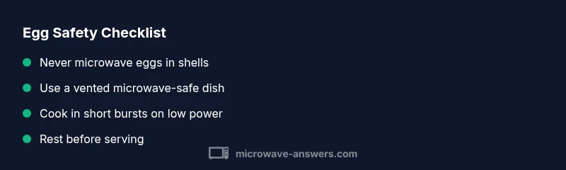 From a safety perspective, remember that the microwave’s fast energy transfer is both a benefit and a hazard when handling liquids and proteins. The Microwave Answers team emphasizes that shell integrity and steam buildup are the real culprits behind most incidents. Treat whole eggs with caution, and always opt for shell-free preparation before microwaving. This guidance is grounded in Microwave Answers Analysis, 2026, which highlights the importance of venting and controlled heating to minimize risk.