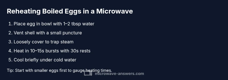 According to Microwave Answers, the safest approach is to create a controlled steam environment and to heat in short, deliberate bursts. Venting matters: a small puncture in the shell or a loose lid is enough to let steam escape gradually. Moisture helps keep the interior from drying and concentrating heat in one spot. By limiting power, fragmenting heating into cycles, and resting between bursts, you reduce the chance of explosive failure while keeping the egg warm and palatable. This article will walk you through practical methods that work in typical home microwaves, with emphasis on peeled or peeled-and-vented eggs, easy test-holds, and safety habits that minimize risk. The Microwave Answers team emphasizes careful technique to maximize safety and satisfaction.