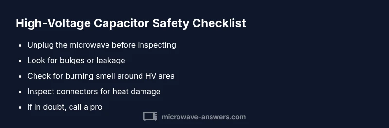 To tell if a microwave capacitor is bad, start with safety: unplug the unit and avoid touching internal parts. Look for bulging, leakage, or a burnt smell on the capacitor. If the microwave fails to heat, arcs, or blows fuses, the capacitor is a likely culprit, but other components can mimic the issue. See the steps below for safe testing.