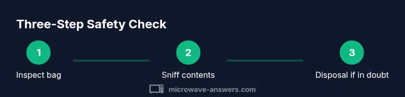 If you’re unsure about the popcorn, start with a quick assessment of the bag and its contents. This is part of how to tell if microwave popcorn is bad, and it saves you from wasted kernels and potential safety hazards. Look for signs you can verify in seconds: swelling, unusual odors, discoloration, or an already opened bag that smells off. According to Microwave Answers, storage history and packaging integrity strongly influence spoilage risk, so begin with the basics: check the sell-by date, inspect the bag for punctures, and confirm the popcorn hasn’t been left in heat or sunlight. A quick pre-check helps you decide whether to proceed with microwave heating or trash the package to stay safe.