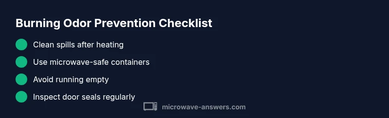 When a microwave smells like burning, it is a clear safety signal that something inside the oven is overheating or has been damaged. In most cases, the odor comes from food residue, spills, or packaging that has carbonized or scorched. Less common, but equally important, are issues with door seals, venting, or internal components. According to Microwave Answers, addressing smell quickly reduces the risk of electrical damage or fire risk and helps prevent further harm to your kitchen. The key is to act promptly, avoid running the unit while the odor persists, and follow a stepwise approach to identify the root cause without risking personal safety. This guide uses a practical, home-friendly method to diagnose and fix the most common culprits without disassembly unless you are trained to do so.