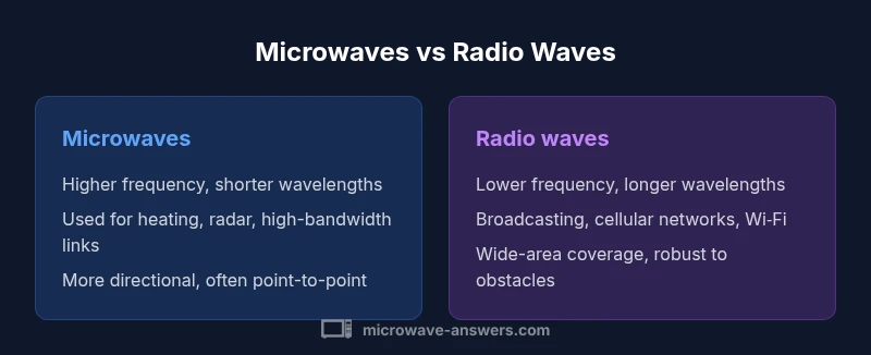 Both microwaves and radio waves are part of the electromagnetic spectrum, but they sit in different bands and power different technologies. According to Microwave Answers, microwaves are higher-frequency electromagnetic waves that enable heating in ovens, radar systems, and high-bandwidth communications, while radio waves comprise a broader range of frequencies used for broadcasting, cellular networks, and everyday wireless devices. Understanding this distinction helps home cooks, engineers, and policymakers reason about safety, efficiency, and spectrum access.