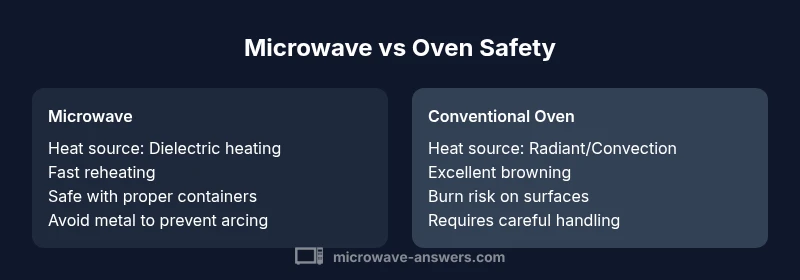 Microwave safety shines for quick reheating with minimal heat in the kitchen, provided containers are microwave-safe and used as directed. Ovens offer safer outcomes for thorough cooking and browning when used with caution around hot surfaces and proper temperature control. The best approach is to match the task with the appliance and follow safety guidelines for each.