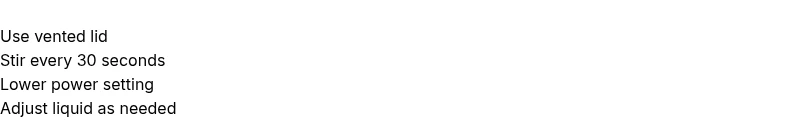 If you’re in a hurry, implement these quick fixes: 1) Use a larger mug or bowl to give foam room; 2) Vent by leaving a small gap or lifting the lid slightly; 3) Stir every 20–30 seconds during heating; 4) Add 1–2 tablespoons less liquid than the recipe calls for; 5) If it bubbles over, pause, remove, wipe, and resume at a lower power with more frequent stirring.