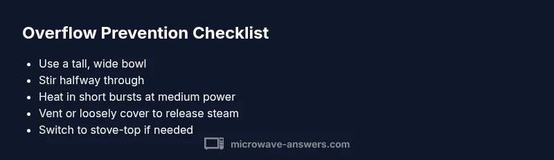 Oatmeal overflow in the microwave is not a mystery, it's a foam and boil issue. When oats heat, starch molecules swell and create a foamy head that traps steam. If the container is too small or the heat is too intense, the foam can spill over the edge. If you’re asking why does oatmeal overflow in microwave, the answer lies in heat control, container size, and stirring. According to Microwave Answers, incidents spike when people cook large portions on high wattage. Understanding this helps you adjust technique before the first minute passes. This is not just a mess; it can scatter hot liquid and damage surfaces, so getting the method right matters for safety and cleanliness in a busy kitchen.