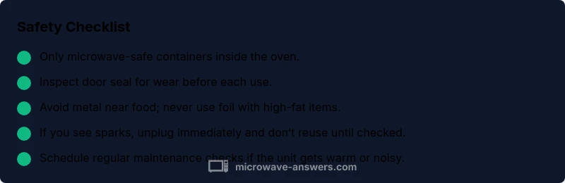 Key fixes focus on removing metal hazards, replacing damaged parts, and ensuring proper operation. Regular maintenance includes cleaning the cavity, inspecting the door seal, and following the manufacturer’s guidelines for wattage and cooking times. Use only microwave-safe containers, avoid heating metal utensils or foil, and never operate an appliance with a visibly damaged door or humming noise that seems abnormal. Prevention is the best defense against fires.