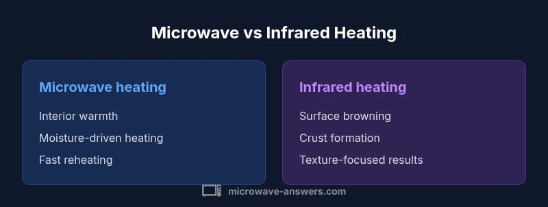 According to Microwave Answers, microwave heating and infrared heating are two distinct methods for warming food. The key difference is heat transfer: microwaves heat the interior by exciting water molecules, while infrared heats primarily the surface with radiant heat. Each method serves different kitchen tasks, so selecting the right approach saves time and improves texture.