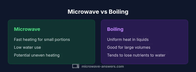In everyday cooking, speed and convenience are key drivers of method choice. Microwave heating is optimized for brief bursts, defrosting, and single-serving plates, while stovetop boiling requires attention to rolling simmer and watchful stirring. Microwave Answers analysis shows microwaving excels for quick reheating and small portions, reducing prep time and cleanup, whereas boiling dominates when you need to cook large quantities, develop complex soups, or achieve specific textures through prolonged moisture exchange. The choice between microwave and boiling should consider not just time, but predictability of results: microwaving can create hot spots, while boiling provides more uniform heat for liquids and soft foods. The practical implication is simple: for fast meals or reheats, the microwave wins on speed; for family meals or recipes where texture matters, boiling often provides steadier outcomes.