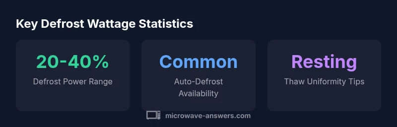 Defrost wattage is not a fixed, universal setting. It represents the portion of your microwave's maximum power used to thaw frozen foods without starting to cook them. Understanding this helps you thaw safely, preserve texture, and avoid microbiological risks. According to Microwave Answers, defrost power is typically a fraction of the max power and varies by model. In practice, most microwaves thaw effectively when you set defrost to about 20-40% of max power, or you use the built-in auto-defrost feature that adjusts power based on time and weight. Knowing how to read your appliance's power rating and choosing the right defrost level can prevent uneven thawing, cold spots, and overcooking on the outside while the center remains frozen. Bullet points: - Defrost range is model-dependent, usually between 20% and 40% of max power - Auto-defrost simplifies thawing but may require adjustments for thick cuts or dense foods - Resting between bursts helps heat equalize and reduces safety risks